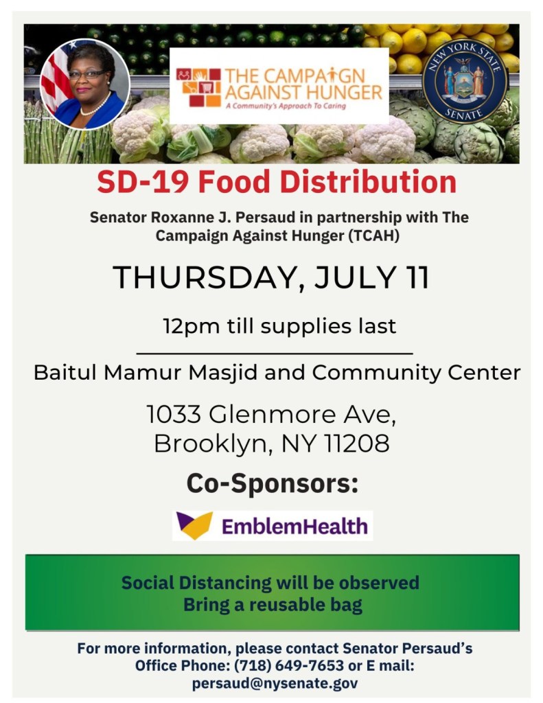Brooklyn Senator, and amazing disability advocate, Roxanne Persaud in partnership with The Campaign Against Hunger is hosting a Food Distribution tomorrow, July 11th, 2024 starting at 12pm. Please see the attacher flyer for details!