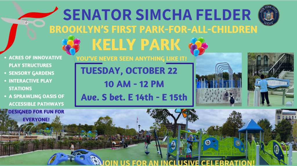 This marks a significant milestone for NYC: the opening of Brooklyn’s first fully inclusive park-for-all-children (Kelly Park), made possible by an unprecedented $10 million grant from Senator Simcha Felder.