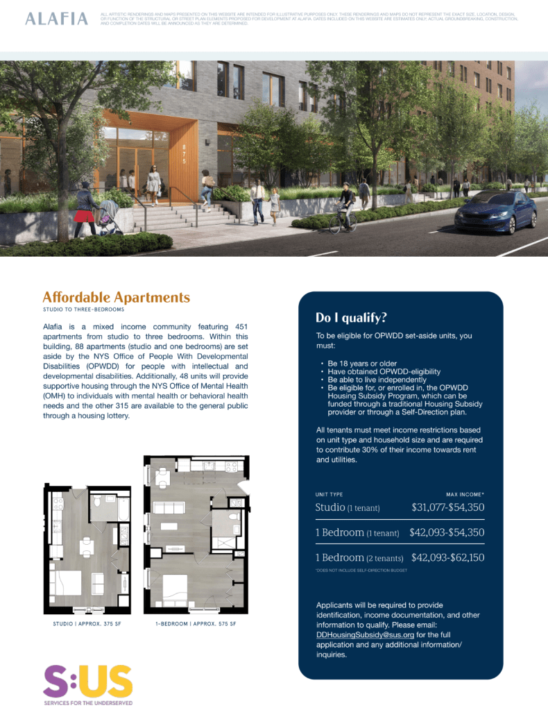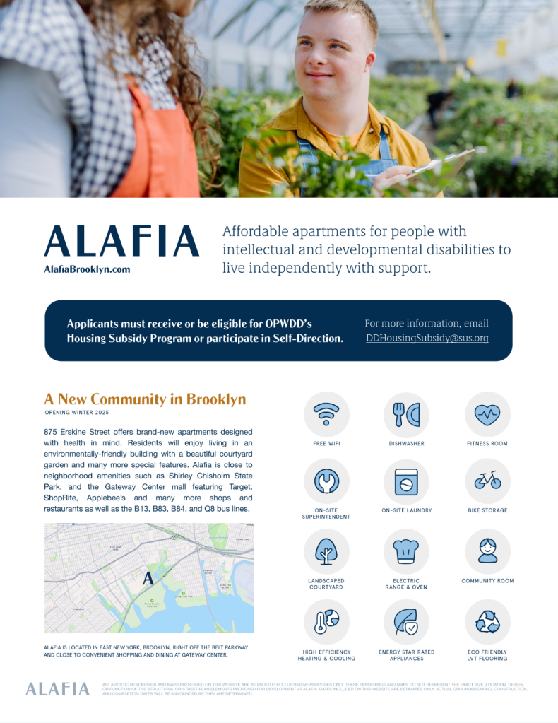 I am writing now to inform you of 88 new opportunities for independent living in East New York. I am hoping to spread the word amongst your membership for anyone looking for a new independent living opportunity for people with I/DD. The building, called Alafia, is located at 875 Erskine Ave. in Brooklyn right behind the Gateway Plaza. The apartments are brand new. We are working with OPWDD to get the word out and I am hoping you can distribute the attached flyer. The building will be opened in late December and ready for move in by January 2025. We will be able to tours starting in December. Can you please forward this to your membership to inform them of this exciting opportunity. I am happy to come and talk to the members if desired or fully available for questions and to work together to get approvals for Housing Subsidy, tax credit and ultimately new studio and one bedroom apartments.